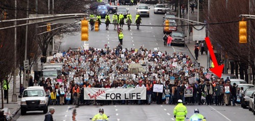 I couldn’t help but think of this scene the other day after my mother called up to scold me. I know, I know. I’m a middle-aged father of two who runs his own business and volunteers up at the church. But if anyone thinks those things exempt a person from getting scolded by his mother… well then, you just don’t know mothers. Anyway, what she was calling about was the fact that she had heard second hand from a friend who was browsing Facebook that I had posted a picture from the Walk For Life in Atlanta last week. This one in fact…